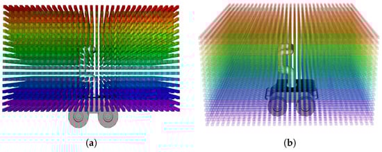 Voxelization of the robot workspace: (a) side view and (b) top view.