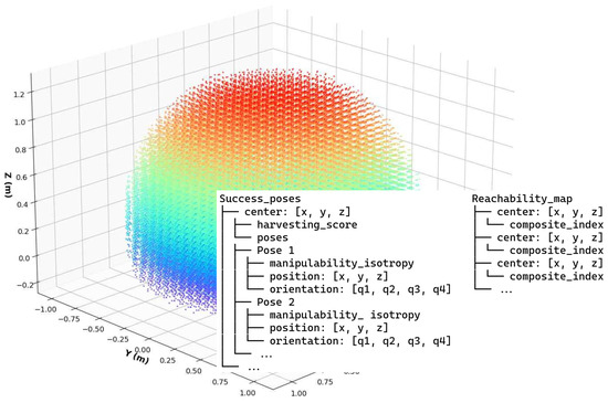 The Reachability Map (RM) is a computational tool used to quantitatively evaluate the capability of a robot manipulator to reach specific poses within its workspace [28]. It provides a spatial representation of the manipulator’s dexterity, enabling quantitative analysis of reachable regions, operational flexibility, and harvesting feasibility. In this paper, the robot workspace is discretized into voxel units, and various poses within each voxel are generated and evaluated based on reachability, harvestability, and manipulability indices.