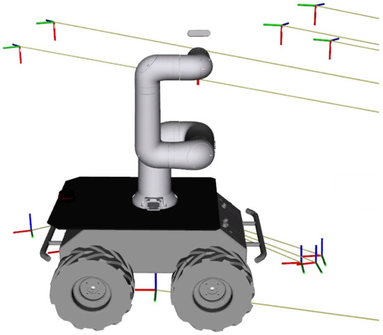 The robot system was implemented as a mobile manipulator composed of the six-degree-of-freedom manipulator Indy7 (Neuromeka) and the mobile robot Husky (Clearpath Robotics). To perform fruit harvesting operations, the system utilized an Intel Realsense D435i camera, IMU, LiDAR, and wheel encoders. Each sensor was implemented in the virtual environment using Gazebo plugins. The configuration of the robot system is shown in Figure 31. This setup reproduced real agricultural working conditions in a simulated environment, enabling effective performance evaluation of the harvesting system.