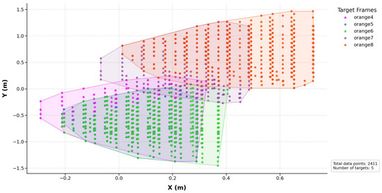 where and represent the known motion of the robot base and the corresponding motion of the camera, respectively, and X is the unknown hand–eye transformation matrix . Several methods exist for hand–eye calibration, including Tsai and Lenz (1989)’s algorithm [17] and Daniilidis (1999)’s dual quaternion formulation [18]. In this study, the dual quaternion approach is chosen for its numerical stability and compact representation of rotation and translation. The procedure involves moving the manipulator to multiple known poses while observing a fixed calibration target.