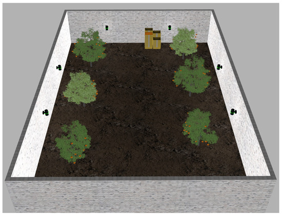The experiments were conducted in a virtual farm environment built using ROS 2 Humble and Gazebo 11 on the Ubuntu 22.04 operating system. This environment was designed to evaluate the performance of the fruit harvesting robot system, as illustrated in Figure 30.
