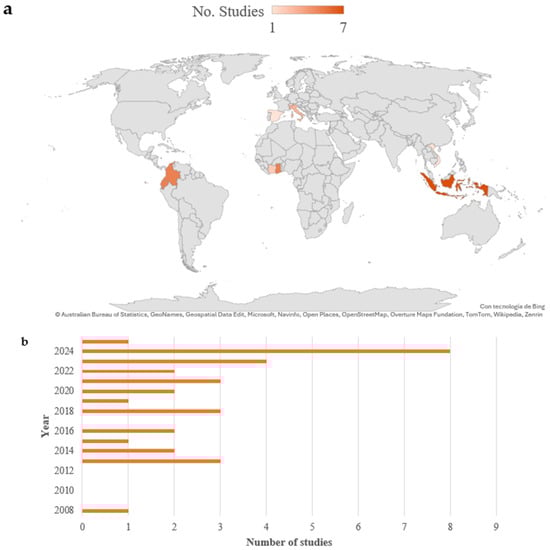 Geographical distribution and temporal trend of the 33 reviewed cocoa LCA studies (2008–2025). (a) Map showing the number of studies per country (the color is proportional to the number of studies, with darker colors indicating a higher number of studies and lighter colors indicating a lower number of studies). (b) Histogram of publications per year. Source: Authors.