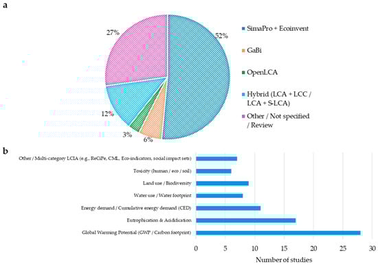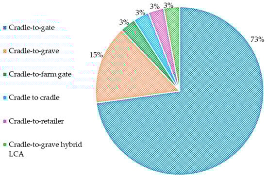 A critical analysis of the system boundaries adopted (see Figure 6) indicates a dominant preference for a “cradle-to-gate” approach (73% of studies), while only 15% adopt a comprehensive “cradle-to-grave” perspective. The remaining 12% of studies used partial or non-standard boundaries. This heterogeneity highlights significant methodological fragmentation that inherently limits the comparability of results across studies.