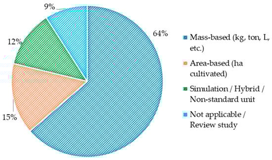 Distribution of functional units used in 33 reviewed cocoa LCA studies. Most assessments adopt mass-based units (≈64%), followed by area-based (15%), hybrid or simulation-based units (12%), and non-applicable cases such as methodological reviews (9%). Source: Authors.
