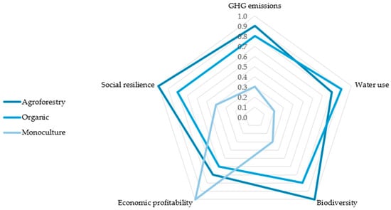 The environmental, social, and economic performance of cocoa is heavily dependent on production systems. Intensive monocultures, which are prevalent in West Africa and parts of Asia, generate high short-term yields but negatively impact deforestation, biodiversity loss, soil degradation, and water pollution. Furthermore, the high dependence on agrochemicals increases GHG emissions and poses risks to human health [32]. In contrast, agroforestry and intercropping systems demonstrate greater sustainability. In Indonesia, ref [44] reported that by diversifying income and strengthening food security, integrating cocoa with other food crops increased profitability by up to 205% and improved social indicators by 23.7%. However, in certain contexts, the complexity of managing these systems can increase input use and associated emissions, necessitating careful management [46].