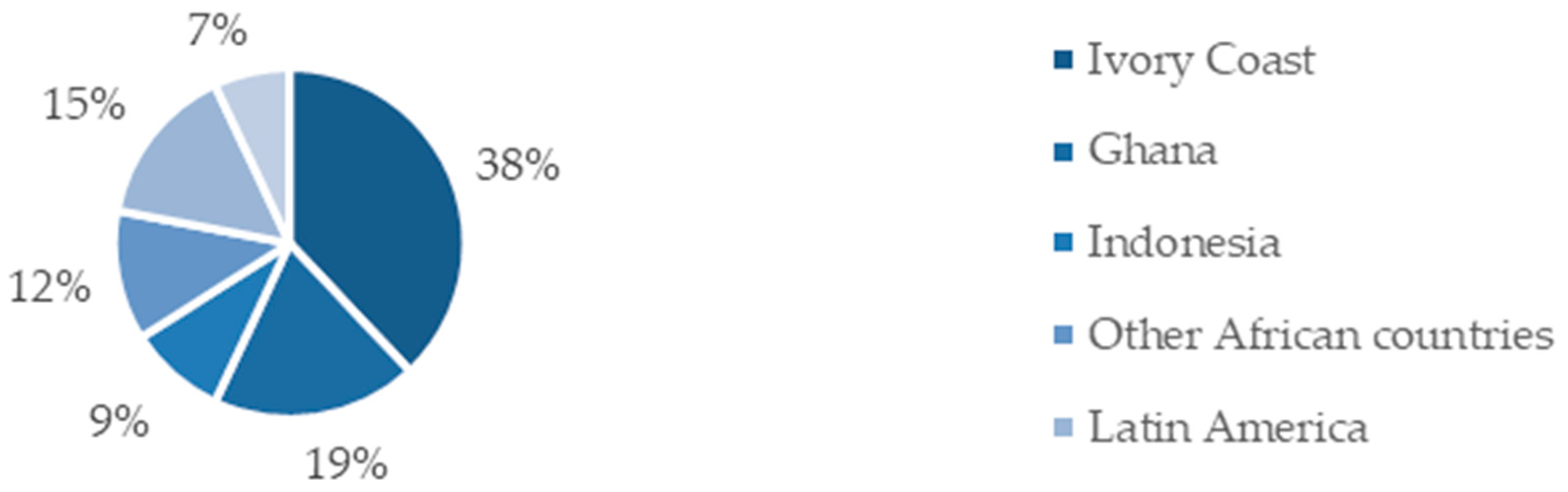 - International Cocoa Organization—ICCO. Cocoa Statistics—November 2023 Quarterly Bulletin of Cocoa Statistics. 2023. Available online: https://www.icco.org/november-2023-quarterly-bulletin-of-cocoa-statistics/ (accessed on 5 February 2025).
