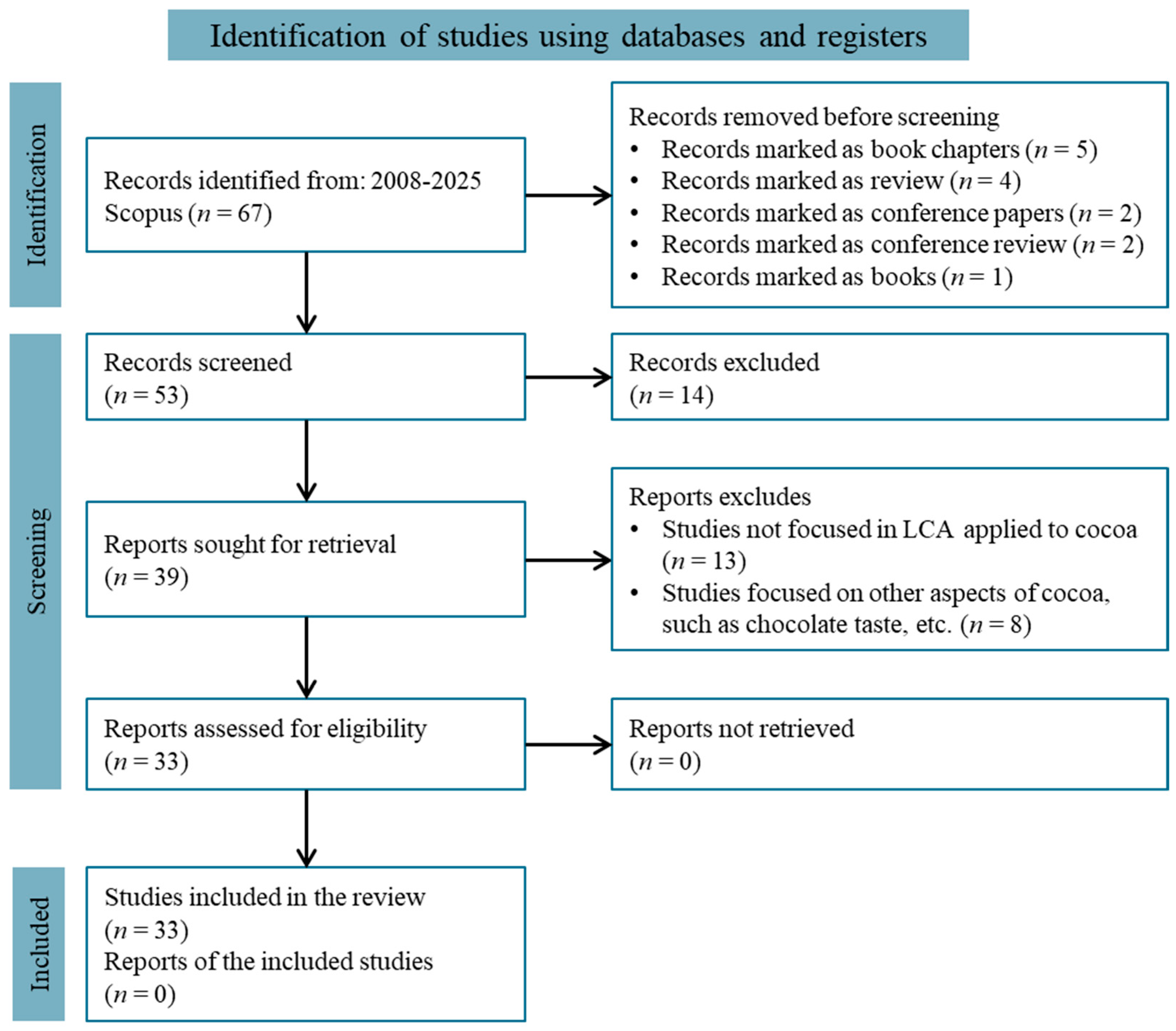 - Focus on at least one stage of the cocoa supply chain. This criterion ensures that the selected literature is directly relevant to the specific product system under review, from cultivation to consumption.
