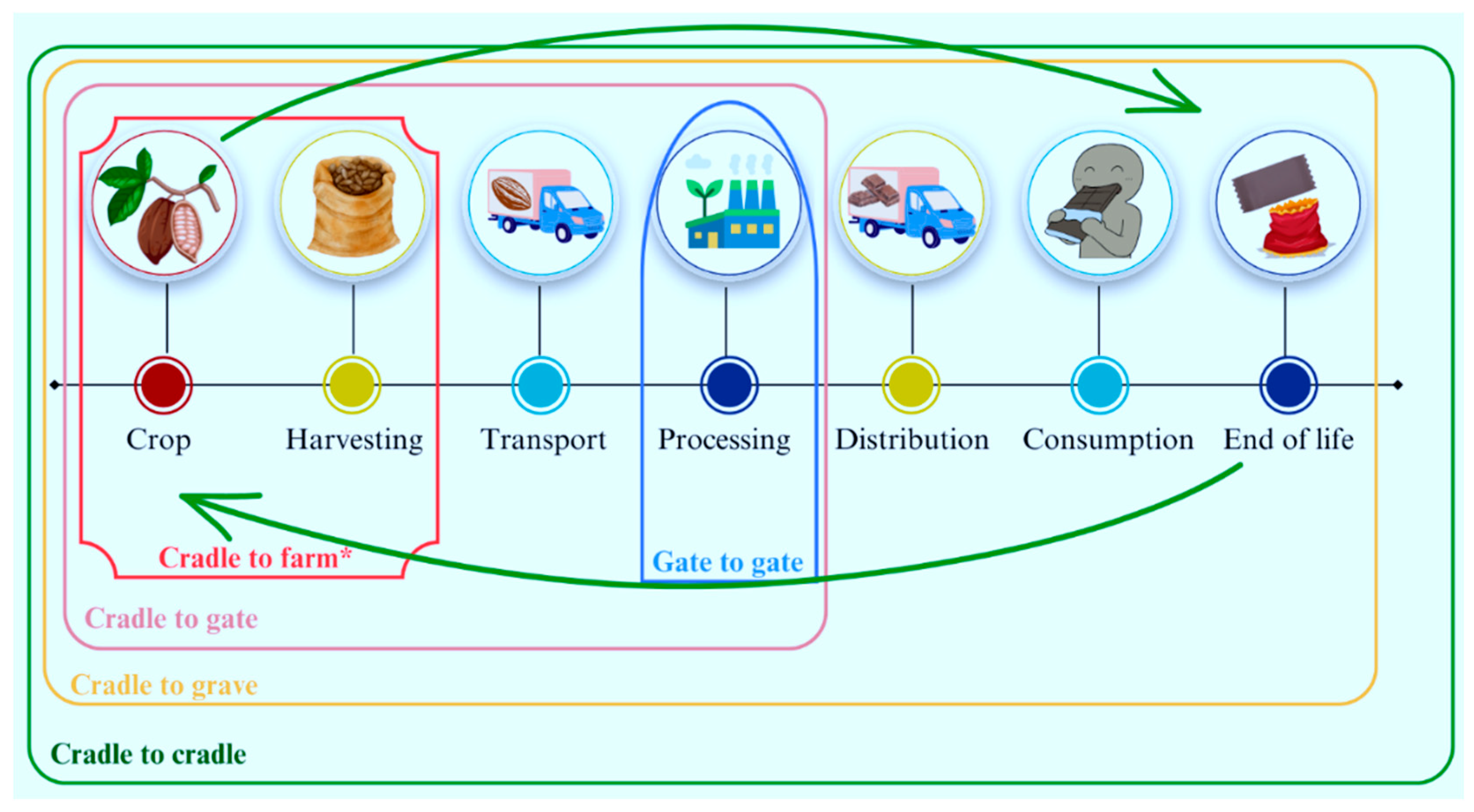 - Wang, S.; Dong, Y. Applications of Life Cycle Assessment in the Chocolate Industry: A State-of-the-Art Analysis Based on Systematic Review. Foods 2024, 13, 915. [Google Scholar] [CrossRef] [PubMed]