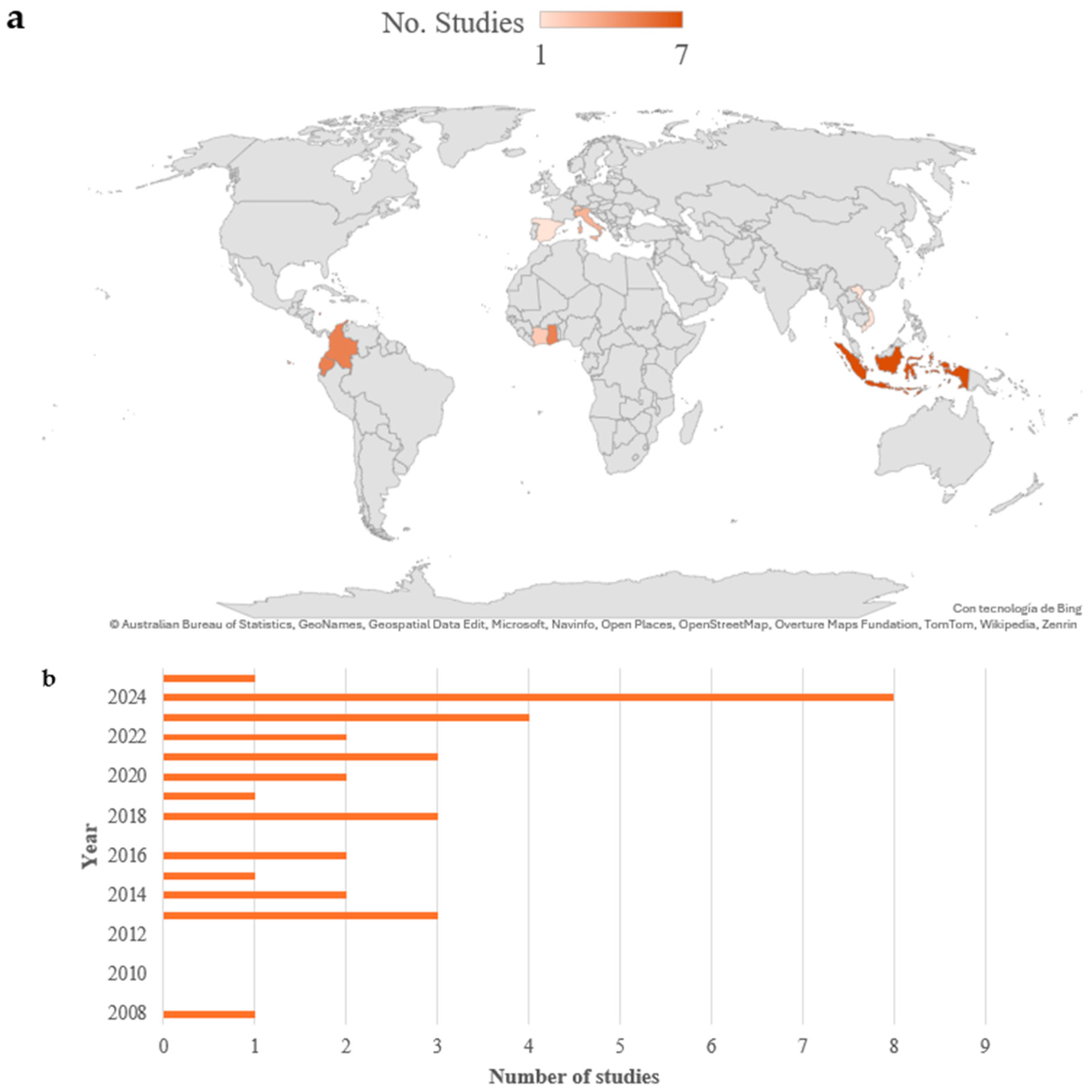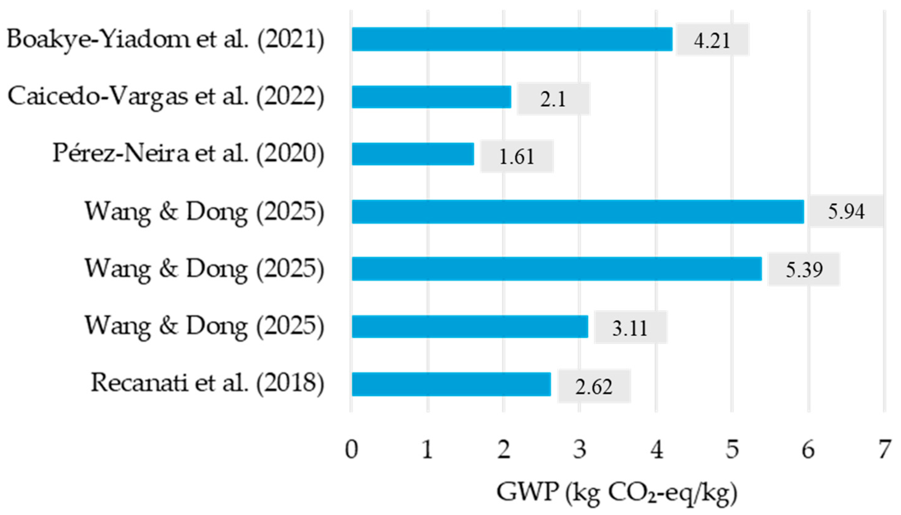 | 26 | Tovar et al. [39] | 2024 | Colombia | Cocoa husk valorization | 1 ton of husk | Cradle to gate | GWP, eutrophication, toxicity | OpenLCA and Ecoinvent | Yes, economic feasibility |