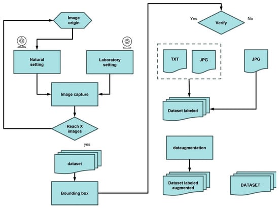 The methodology adopted in this work involved a series of steps (Figure 1). In this sense, the collection of images from chromotropic traps (yellow sticky panels; Econex S.L., Murcia, Spain), targeting the olive fruit fly was the starting point for building the dataset. Following this, manual labeling was carried out to annotate each instance of the fly in the images. Data augmentation techniques were also applied to artificially enhance the size and diversity of the training dataset. The labelling of the images represented a key aspect for the subsequent training of the convolutional neural network models (CNN).