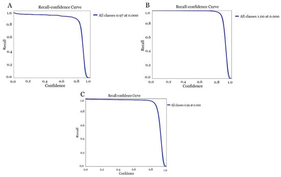 The results obtained in the generation of the models exceeded 0.97 accuracy in the detection of the olive fruit fly, even reaching 1 (100%) in model 2 (laboratory model). The first model (Figure 14A) created with the field dataset obtained an accuracy of 0.97 in detection. On the right-hand side of the curve, where the confidence threshold is high, the model is very selective, meaning that it only predicted as positive those instances where it was very confident, resulting in high accuracy but low recall. For the laboratory-derived model (Figure 14B), it was similar to the first one. In this case, it indicated a recall of 1 (100%) in all classes for a confidence threshold of 0.00. This means that the model correctly detected all relevant instances for a very low confidence threshold, differing slightly in the global model obtained, where the field and laboratory datasets were combined (Figure 14C). In this case, a recall of 0.99% was obtained.