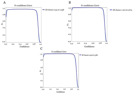 Looking at the confidence curve in the three models obtained for each dataset, it was observed that all three again exceeded the 0.95 confidence range. The field model (Figure 15A) did show a slight decrease with the 0.95 as opposed to the recall. The model was shown to perform with a specific confidence range achieving an F1-score close to 0.95 when the confidence is around 0.558. However, it was noted that when the confidence increases too much the performance of the model decreases, which can affect the model being too strict in its judgement, resulting in increased errors. The laboratory model (Figure 15B) achieved an F1-score of 1 (100%) when the confidence was around 0.674. In the case of the global model (field and laboratory images) (Figure 15C) it achieved an F1-score of 0.99 when the confidence was around 0.580, with performance decreasing as confidence increased (Table 1).