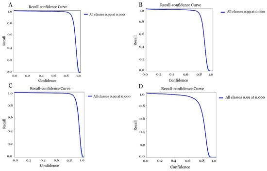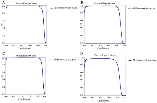 Evaluation of the confidence curve in the different models for olive fruit fly detection. (A) model obtained with YOLOv5s 300 epoch, (B) model obtained with YOLOv5s 3150 epoch, (C) model obtained with YOLOv5m 300 epoch and (D) model obtained with YOLOv5m 150 epoch.