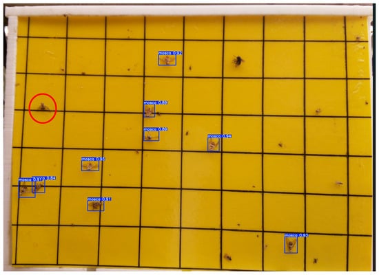 Example of inference showing one false negative in a field image. Missed detections are associated with reduced visual contrast, small object size, or partial occlusion due to adhesive reflections.