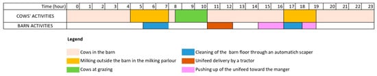 During the experiment, cows were mainly housed in the barn except from 8:30 to 10:00 a.m. when they were at grazing in the early morning. Milkings occurred twice a day in a milking parlor located in a building close to the experimental barn (Figure 1). At the beginning of each session, the barn was empty; however, as each cow completed milking, each animal progressively returned to the barn. Therefore, at the end of each milking session (i.e., within approximately 3.5 h), all cows were back in the barn. The barn activities included the cleaning of the barn floor in both feeding and service alleys through automatic scrapers in the morning and in the afternoon. The feed was delivered by a feeding tractor every day at 10 a.m., and during the day, the farmer manually pushed up the feeding to the manger twice in the afternoon to ensure feed accessibility for cows. To better understand the sequence of the activities within the farm, Figure 3 shows the daily barn management related to both animals and the farmer’s activities.