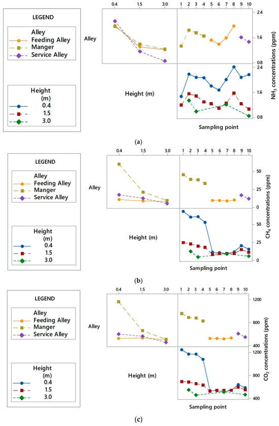 Gas concentrations are affected by the sampling location in the barn, with uneven gas distribution observed at different sampling points for CH4, NH3, and CO2. Figure 4 shows interaction plots for NH3, CH4, and CO2 concentrations, measured at three heights (i.e., 0.4 m, 1.5 m, and 3.0 m) across three barn areas (i.e., feeding alley, manger, and service alley). The results highlighted the variation in gas distribution both horizontally and vertically among the sampling points.