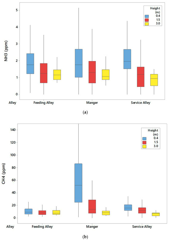 NH3 showed a strong Height effect (p < 0.001), whereas the main effect of Alley alone was not significant (p = 0.186). The Alley × Height interaction was significant (p < 0.001), due to the different vertical gradients among functional areas in the barn. Figure 4a highlights the steepest NH3 concentration decline between 0.4 and 3.0 m, due to the air dilution away from the source of gas production. For this reason, the mean value of NH3 concentrations decreased with increasing Height from the floor (Table 2). In detail, Figure 4a shows that the lowest NH3 variability has been recorded in all alleys at a height of 3.0 m from the floor.