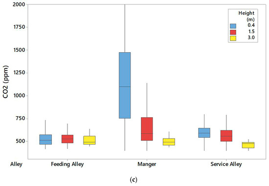 Boxplot of (a) ammonia (NH3), (b) methane (CH4), and (c) carbon dioxide (CO2) concentrations (ppm) measured at three sampling heights above the floor (40, 150, and 300 cm) across different barn locations (feeding alley, manger, and service alley).