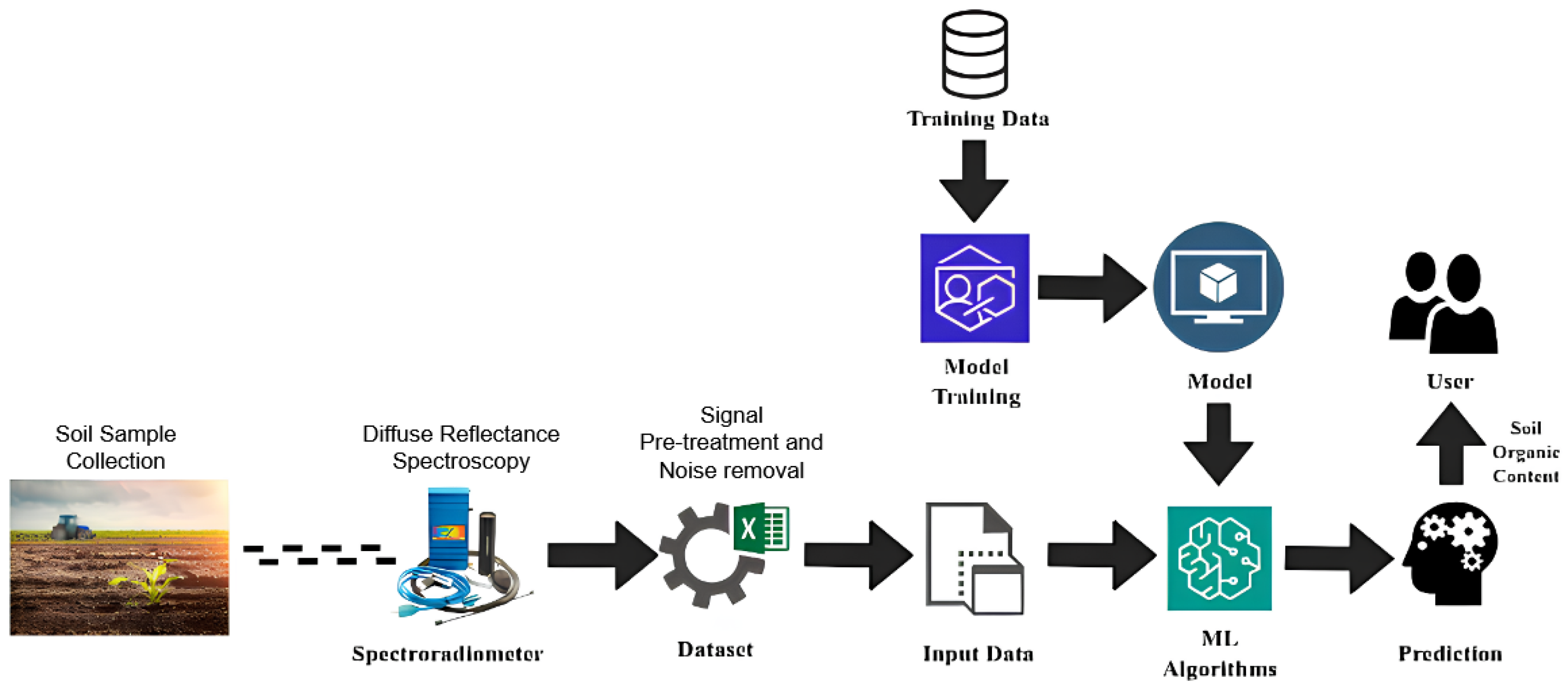 The workflow of this study involves the use of hyperspectral imaging of the organic content of the soil with the help of the machine learning-based regression analysis shown in