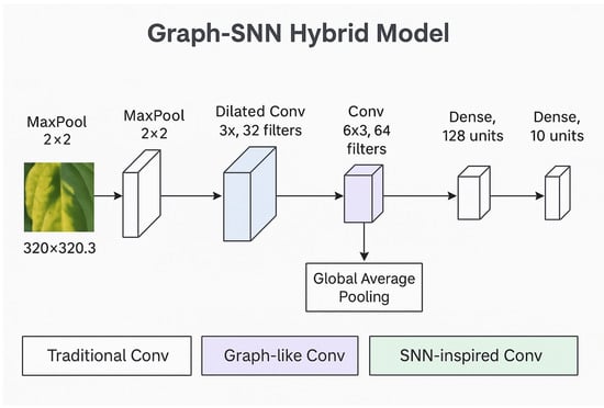 Figure 4 offers a visual representation of the described model. The input images were reshaped to 320 × 320 × 3 in order to preserve spatial and color details, essential for the analysis of leaf disease. The following layer performs initial downsampling to reduce spatial resolution while maintaining dominant visual features. Dilated Convolution layer records long-range spatial dependencies across the leaf by simulating graph-like receptive fields. The next layer is the SNN inspired convolution, which enables the model to respond selectively to the changes of the lesion texture and boundaries. At this point, the global average pooling encapsulates spatial information into a compact vector. The next dense layer learns high-level representations for disease classification, and the last layer produces a probability distribution over the ten given disease classes.
