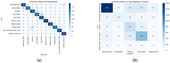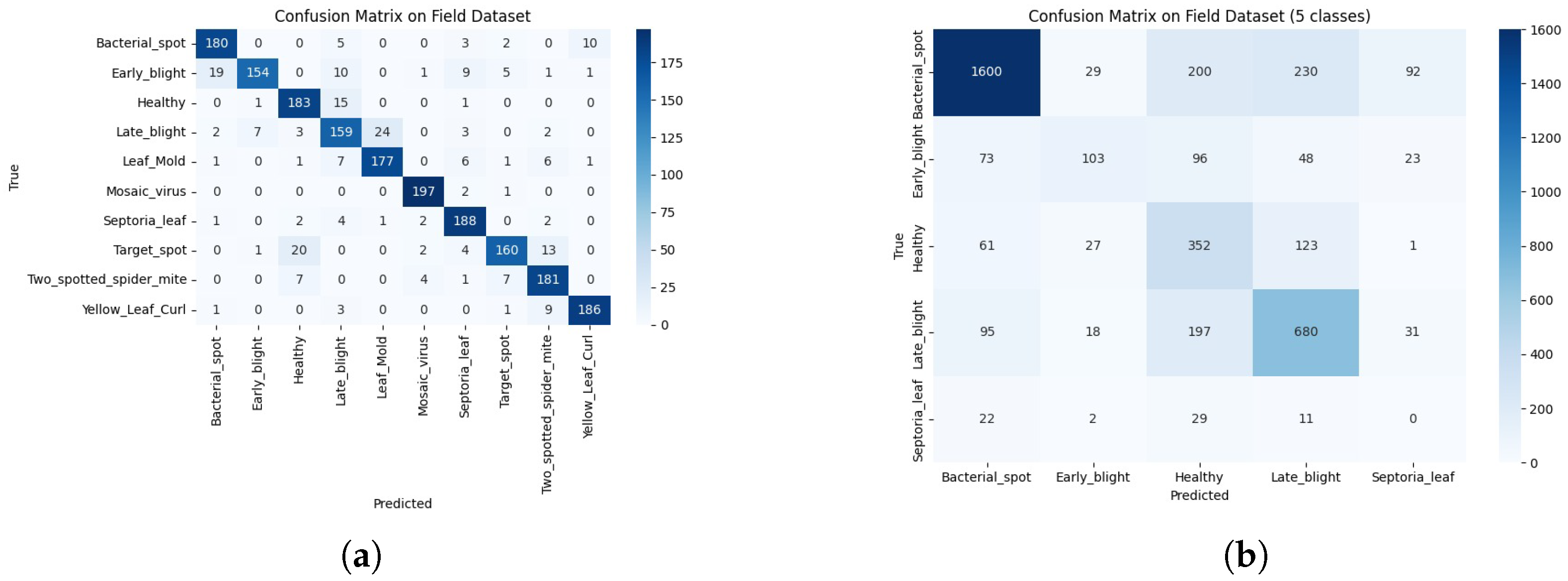 Figure 10 further illustrates the evolution of class-specific performance across the five field classes. Before fine-tuning, the predictions were broadly dispersed, with each class exhibiting substantial misclassification into multiple alternative categories. Bacterial spot showed the highest concentration of correct predictions, but also notable confusion with healthy and late blight. Early blight showed a diffuse error pattern, with samples distributed across all four other classes. Healthy images were frequently misassigned as Late Blight, while Late Blight itself showed pronounced overlap with bacterial spot and healthy. The minority class, Septoria leaf spot, exhibited minimal correct predictions and a high degree of scattering across the confusion matrix.