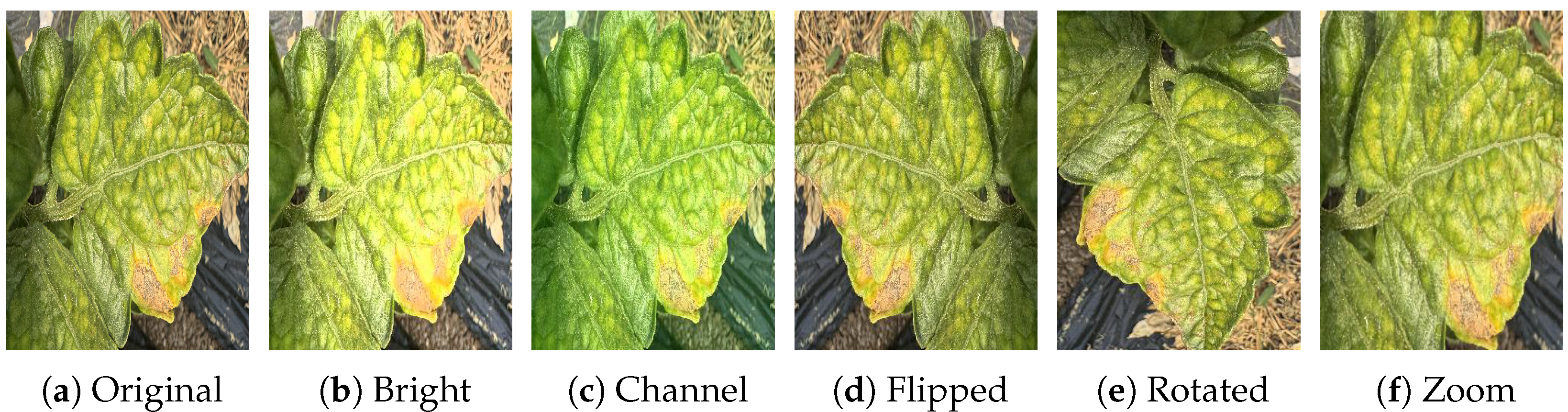 Since the field dataset is limited in size, certain diseases are represented by only a few images. In order to increase the robustness, we first implemented data augmentation techniques, such as rotation, horizontal and vertical flipping, randomized zooming, and brightness adjustment. After applying augmentation techniques, the size of the dataset increased severalfold. Five additional images were generated based on a single reference: one with brightness adjustment, one with randomized zooming, one with channel adjustment, one flipped, and one rotated.