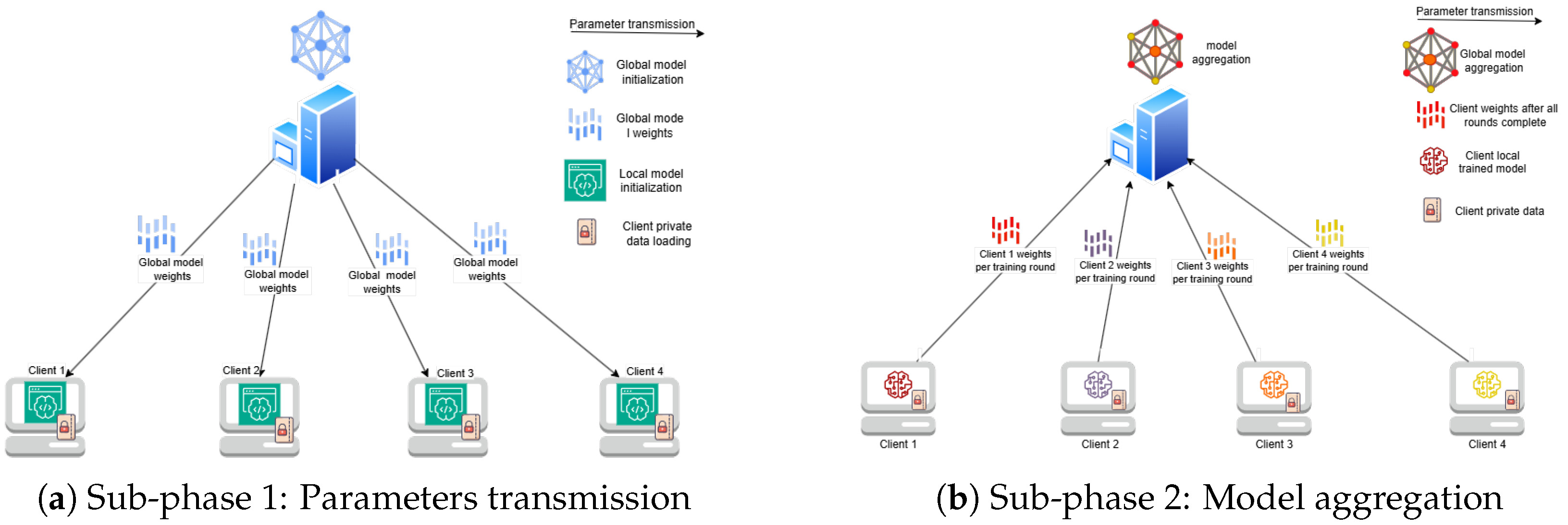 When all participants complete the training, the model aggregation sub-phase starts, where the received parameters are combined and used as input for the initial hosted model. The server uses its own test dataset to validate the novel aggregated model.