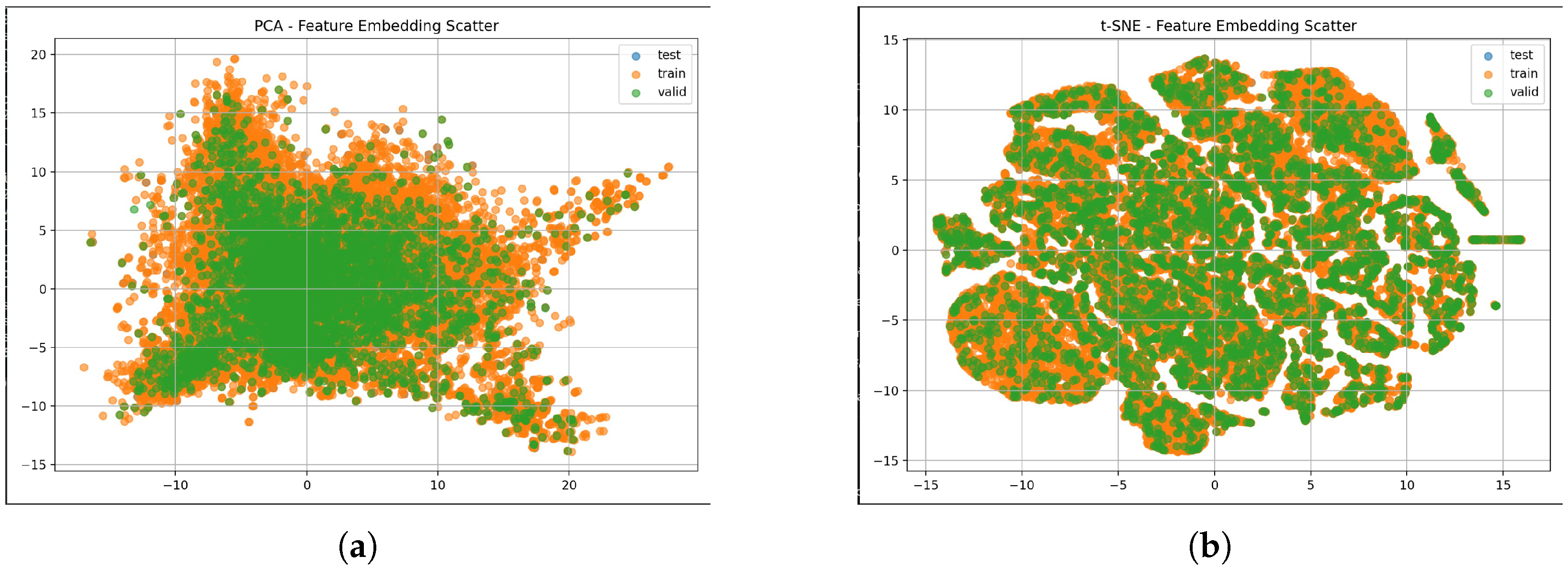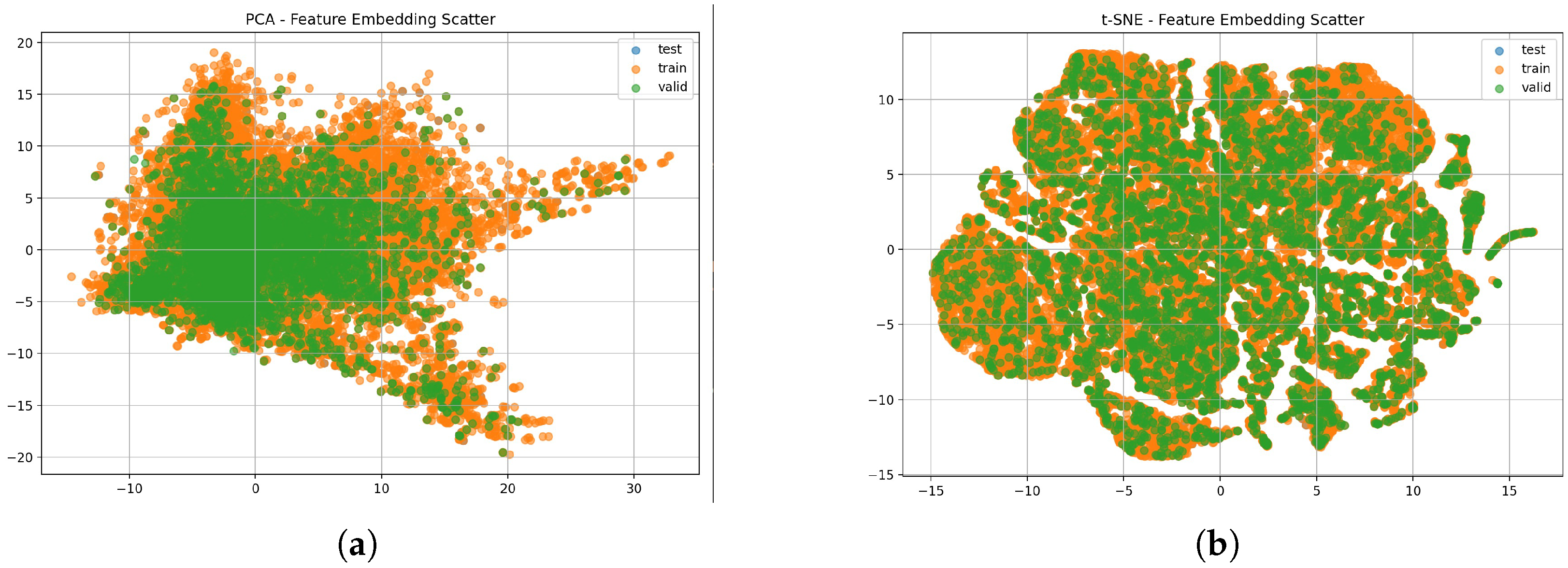 The feature embedding visualizations obtained through PCA and t-SNE are shown in