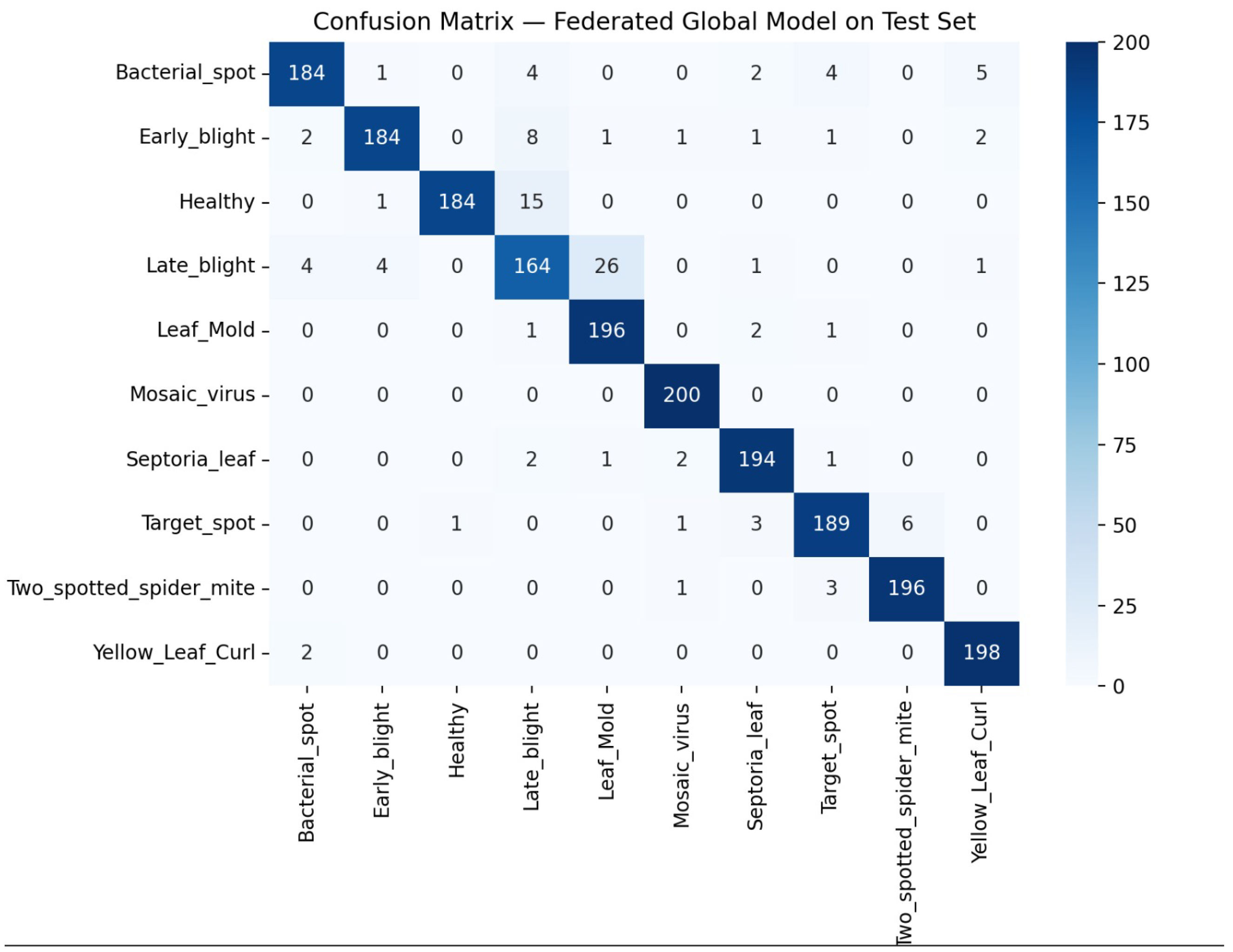 The centralized experiments revealed a clear divergence in model performance between laboratory and field datasets. When trained on publicly available datasets, our model achieved an accuracy of 88% and demonstrated balanced precision and recall across all ten classes. However, this phase resulted in a substantially lower accuracy on the field dataset. Despite applying data augmentation, several classes, such as Septoria or Early blight, remained challenging for the model. The reduced performance of the model in this scenario highlights the difficulty of direct transfer techniques that perform well on curated laboratory dataset to real-world agricultural settings.