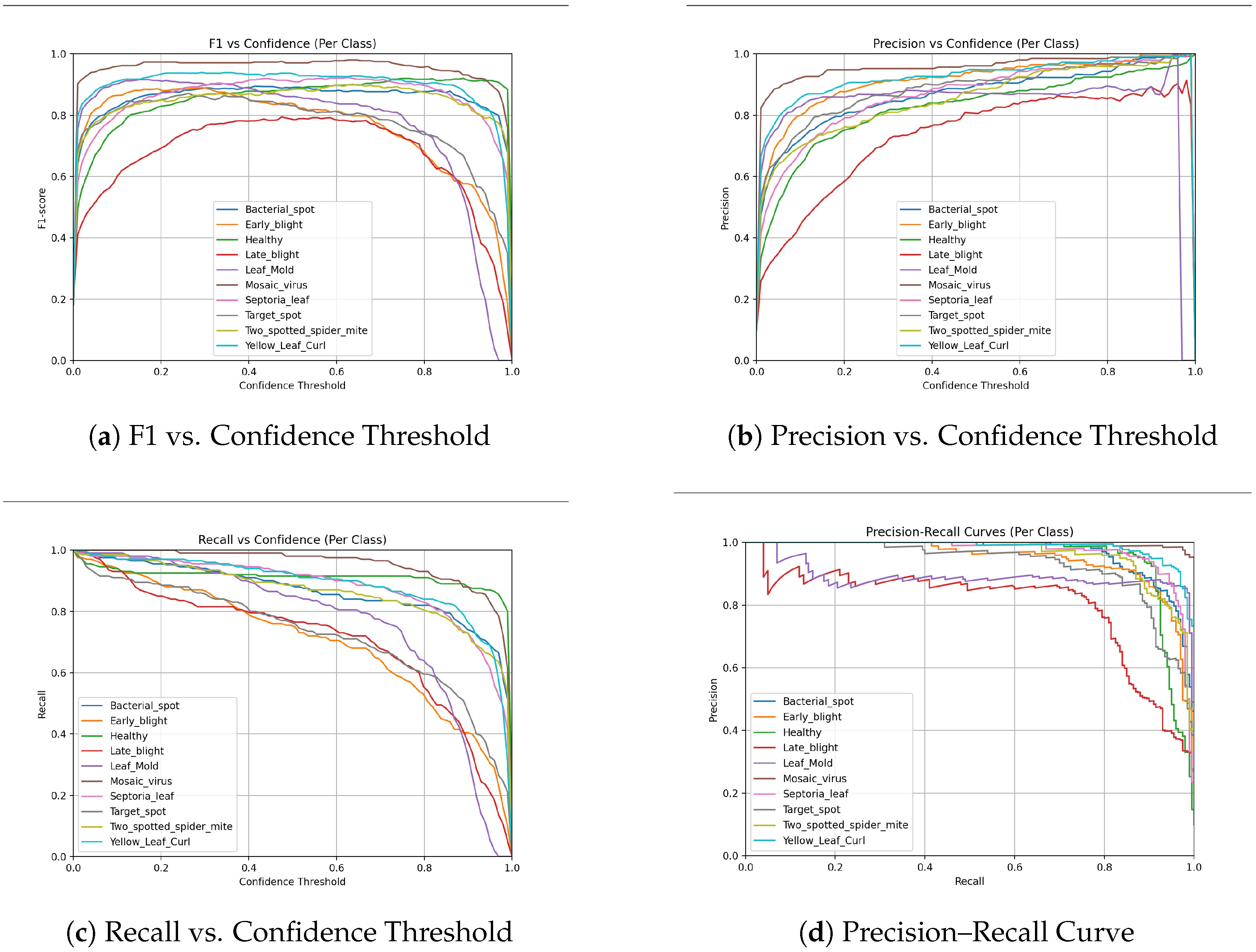 Although augmentation increased the number of training samples, it did not generate additional biological variability or novel lesion morphologies and therefore could not fully compensate for the limited diversity of the original images from the minority-class. In addition, the fine-grained and sometimes overlapping characteristics of Septoria and Early blight lesions are often obscured by field-related factors, such as variable illumination, surface residues, and background clutter. These environmental complexities further affect the ability of the model to learn robust discriminative boundaries for minority classes.