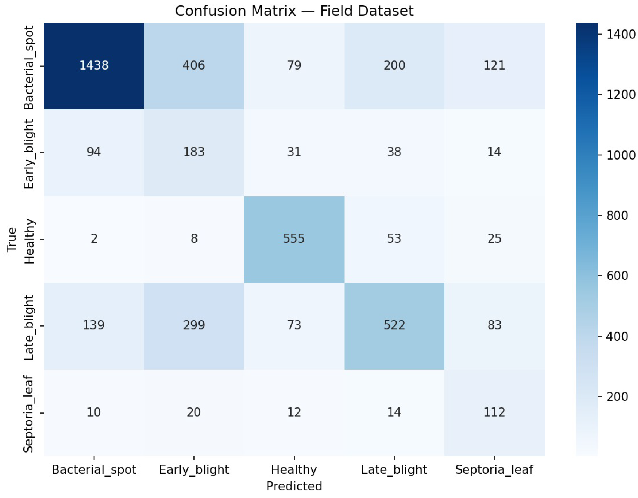 Figure 10 also shows that errors persist in characteristic ways that reflect the inherent difficulty of the field domain. Misclassifications remain common between visually similar conditions, and the two minority classes, Septoria leaf spot and Early blight, although showing slight improvement, continue to exhibit widely dispersed error patterns. These observations point to underlying challenges such as the subtile visual distinctions between certain diseases, the limited diversity and imbalance of the field dataset, and the residual effects of the domain shift between laboratory and field images. The patterns visible in the fine-tuned confusion matrix provide a clear starting point for a broader analysis of model limitations, data constraints, and adaptation needs, as examined in detail in the following section.
