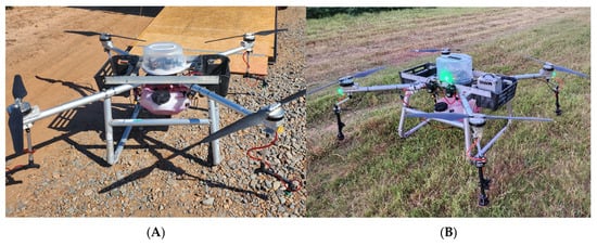 Spray drones used in the test mounted with (A) standard hydraulic orifice system and (B) centrifugal/rotary spray system.