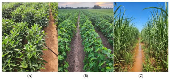 Different crops tested for spray infiltration into the canopy; (A) soybeans, (B) cotton, and (C) sugarcane.