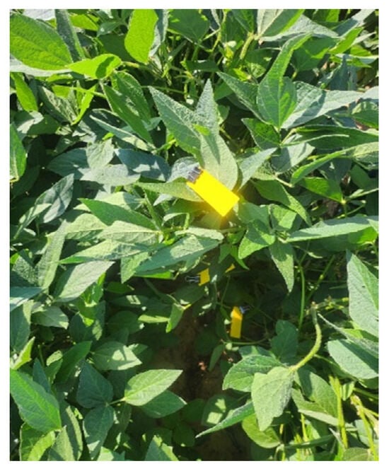 Experiments were conducted in each of the three fields utilizing a 40 m by 5-row area chosen based on homogeneity and location (easy access, nearby take-off and landing area, etc.). Just before each test (flight), water-sensitive cards (WSPs) by TeeJet Technologies (26 × 73 mm each) were clipped to the top, middle, and bottom levels of three different plants separated by 1 to 3 m in that row (Figure 3). The water-sensitive cards were placed on the adaxial side of the leaf using a small binder clip (Office Depot) and on two randomly selected plant leaves directly below the top card leaf in the middle and bottom (or last leaf position location) areas of the plant. Care was taken while clipping to prevent damage to the leaves or causing undue weight, pulling the leaf down (especially in soybean), sometimes clipping the card to two to three stacked together or a leaf stem. All cards were facing up.