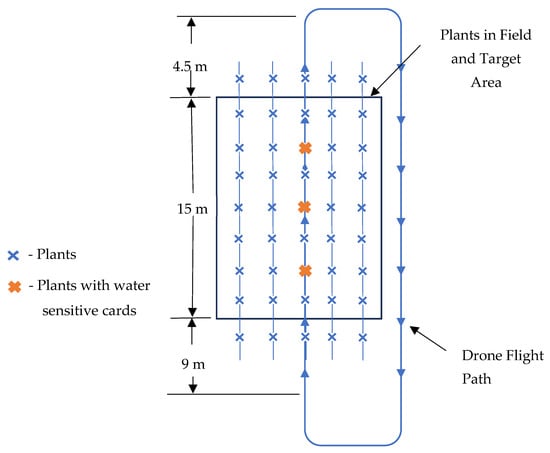 The drones’ settings during the experiment are shown in Table 1. Flights were performed randomly and over the middle row of the crop where the cards were placed with a slight offset (0.3 to 0.8 m) to not be directly over the center of the drone (where low-density spray areas could exist) and in a racetracsk-type pattern (Figure 4). The drone was then landed, the cards were picked up, and the next test was performed. Three different application heights—low altitude [1.2 m or 4 ft], medium altitude [3 m or 10 ft], and high altitude [6 m or 20 ft]—were tested. Each treatment combination is shown in Table 2 and was completely randomized during testing. Tank loads (during testing) consisted of normal tap water with no adjuvants.