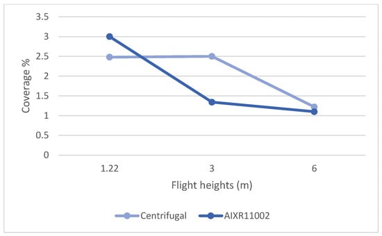 The spray coverage from both nozzles subsequently decreased as the flight height was increased. However, the pattern was not the same (Figure 5). A higher difference in the spray coverage was seen at 3 m flight height from the nozzles. The centrifugal nozzle-mounted drone had consistent spray coverage from 1.2 m to 3 m, whereas a sharp decline was seen in the AIXR11002 nozzle-mounted drone. The different spray mechanisms in these nozzles can explain this phenomenon.