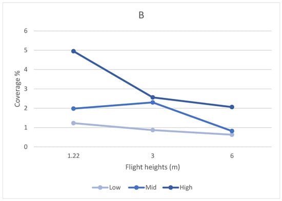 Interestingly, no significant differences were observed in the spray deposition and coverage across the different flight heights for sugarcane and soybean. Previous studies showed that for a typical UAV sprayer, a flight height of 2 m for soybean [] and 2–4 m above the canopy for sugarcane [] was desirable. However, these studies did not test higher flight heights (>4 m), leaving the effects of these heights on the spray characteristics unexplored. Our results did not provide evidence that different flight heights for sugarcane and soybean at the late vegetative to early reproductive stage have significant effects, suggesting that further research should be considered with robust methodologies with more extensive data.