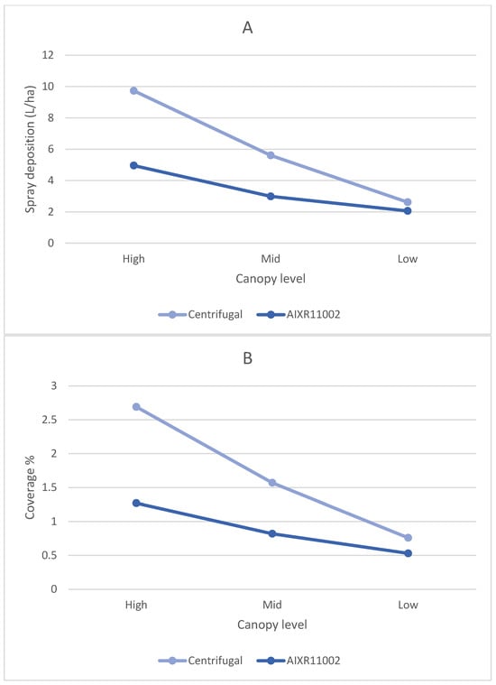 Mean spray deposition (A) and coverage percentage (B) from centrifugal and AIXR11002 nozzles on upper, middle, and lower canopy levels in sugarcane.