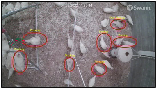 We installed six PRO-1080MSB night-vision network cameras from Swann Communications USA Inc. (Figure 1; Santa Fe Springs, CA, USA) strategically above the drinking stations, feeders, perches, and on walls approximately three meters high to capture both overhead and lateral video footage. The continuous monitoring of various hen behaviors and activities was performed, with all video data being recorded on DVR-4580 digital video recorders from the same manufacturer. The recordings were saved in .avi format at a resolution of 1920 × 1080 pixels and a frame rate of 15 frames per second, then converted to .jpg image files using Free Video to JPG Converter software (version 5.0).