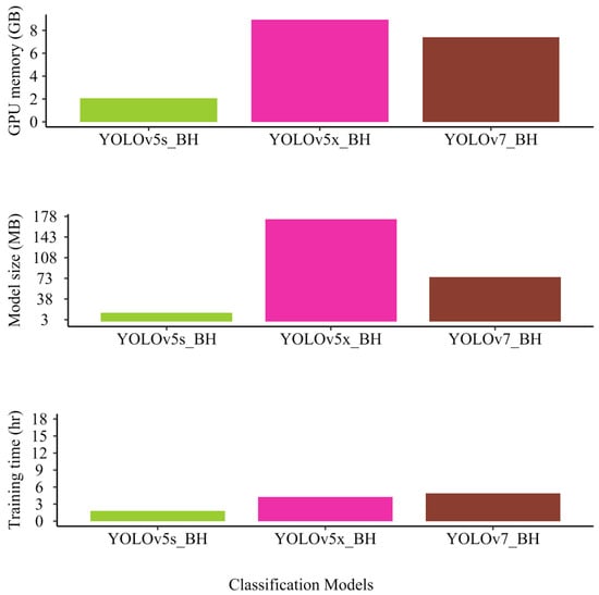 Figure 5 illustrates the attributes of YOLOv5s, YOLOv5x, and YOLOv7 models, including their usage of GPU memory, model size, and the duration of their training time. Regarding the duration of the training process, YOLOv5s_BH required nearly 5 h, whereas YOLOv5x_BH and YOLOv7_BH had a longer training time of 12.5 h and 14 h, respectively. YOLOv5x_BH is the biggest model, measuring 173.1 mb, while YOLOv7_BH comes in second with a size of 74.8 mb, and YOLOv5s_BH is the smallest with a size of 14.4 mb. YOLOv5s_BH stands out as the most efficient model regarding both time and GPU usage, but it has the smallest size among the three models. YOLOv5x_BH, on the other hand, is the largest model with the highest GPU usage, while YOLOv7_BH requires less GPU usage compared to YOLOv5x_BH. This information is crucial as it can affect the selection of computer systems and the speed of data analysis.