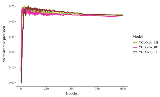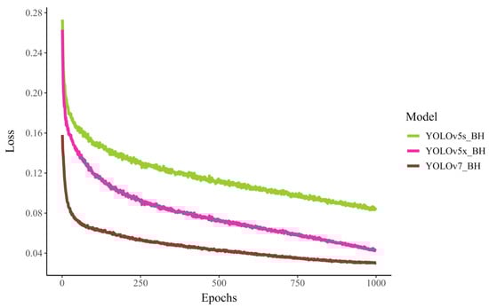 All three models’ full training loss function decreased while running in 1000 epochs (Figure 6). The total loss in the YOLO model is the sum of three loss functions (box/localization loss, classification loss, and objectness loss) used to optimize the model’s performance. In addition, the total loss is used to update the model weights during backpropagation to minimize the loss and improve the model’s accuracy on the training data.