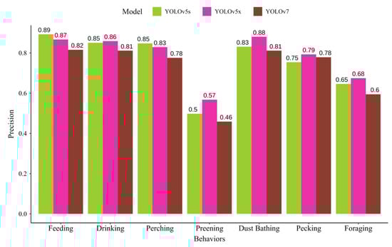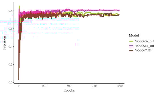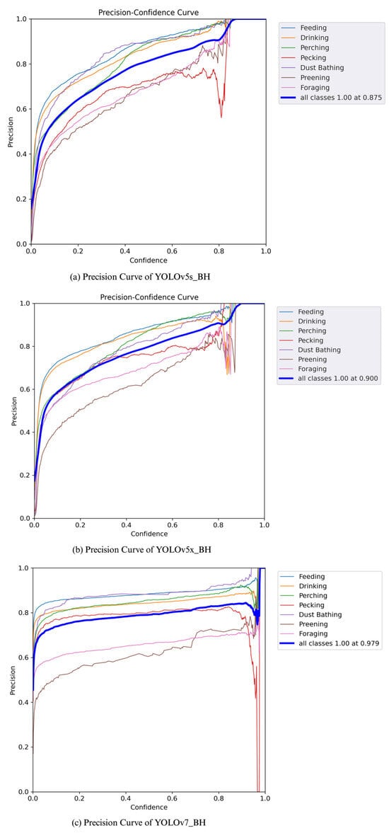 The precision curve of the YOLOv5s_BH, YOLO-v5x_BH, and YOLOv7_BH in behavior detection.