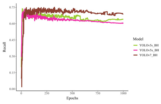 The recall curve of the YOLOv5s_BH, YOLOv5x_BH, and YOLOv7_BH in behavior detection.