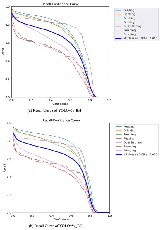 In Figure 11a, the YOLOv5s_BH model initially achieves a recall of 93% for the behavior classes, which then declines as the confidence score approaches 1. Similarly, Figure 11b illustrates that the YOLOv5x_BH model starts with a recall of 89%, mirroring the YOLOv5s_BH model, and gradually sees a decrease in recall as the confidence score increases to 1. In Figure 11c, the YOLOv7_BH model begins with a recall of 79%, which progressively diminishes as the confidence score rose to 1.