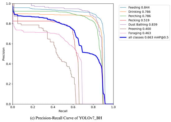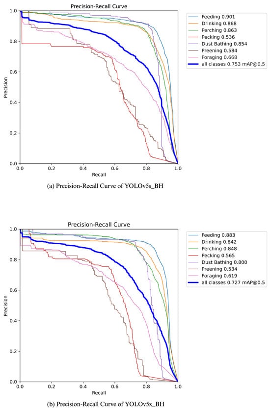 The precision–recall curves were analyzed to assess the behavior detection performance of all three models as confidence scores varied for each class. This evaluation method helps determine the models’ ability to maintain high precision while increasing recall. As shown in Figure 12a–c, the combined precision × recall values and mean average precision (mAP) for all behavior classes are 75.3% for YOLOv5s_BH, 72.7% for YOLOv5x_BH, and 66.3% for YOLOv7_BH.