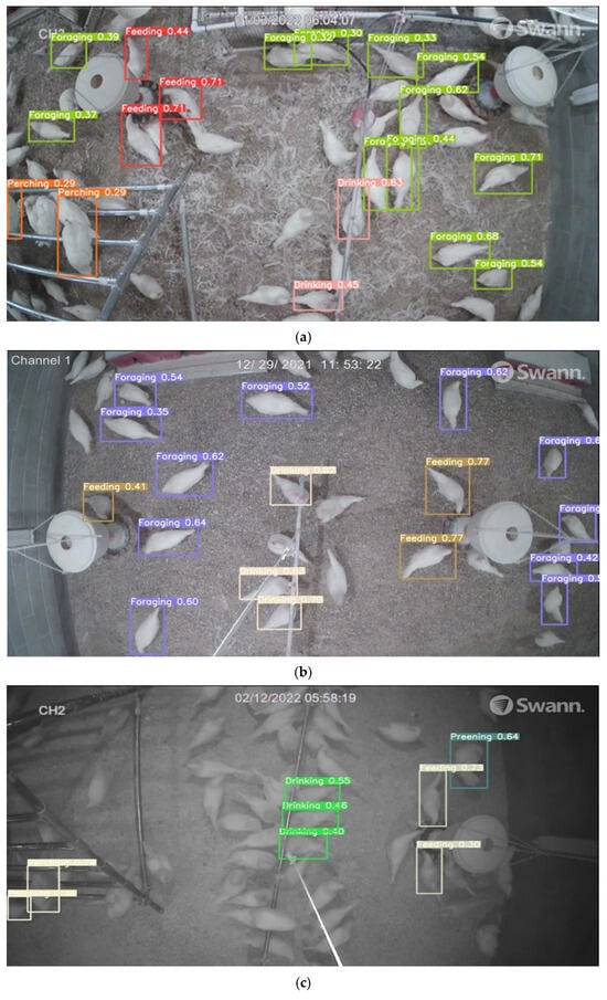 Six behaviors of laying hens, namely standing, sitting, sleeping, grooming, feeding, and drinking, were classified using deep learning [10], classifying the latter two behaviors with an accuracy of 89% [11]. The image classification methodology, developed to identify broiler breeders’ behaviors using machine vision techniques, demonstrated a success rate of over 70% in recognizing behaviors such as wing spreading, bristling, drinking, scratching, resting, stretching, preening, and mounting [4]. In addition, flock behaviors (crowding near feeders) were recognized using a CNN architecture with an accuracy of 99.17% [12]. A machine vision method proved to be a practical tool for tracking abnormal behaviors in poultry, such as pecking [13]. The mask region-based convolutional neural network was developed for detecting preening behaviors in birds [14]. An improved deep learning model based on the YOLOv5 architecture was developed to monitor the spatial and floor patterns of cage-free hens, including the real-time tracking of bird numbers in zones like perching, feeding, drinking, and nesting, achieving an accuracy of 87% to 94% across all chicken ages and zones [15].