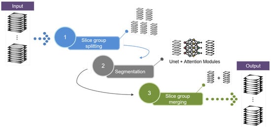 In the context of soil CT scans, the generated image volumes usually have thousands of slices with high width and height dimensions. Considering this, in this step, the input volume is divided into groups of eight contiguous slices in order to process each of them, reducing computational costs compared to processing the entire volume. The choice of contiguous slices in a group was made to maintain the continuity of the pore structure, which would be incorrectly characterized if random slices were grouped together. In addition, the number eight was chosen due to the limitations of the CNNs used in the segmentation step, which will be explained in the next section.