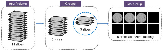 It should be noted that when a volume has a total number of slices that is not divisible by eight, a zero padding strategy is applied. In this case, slices with zero pixels will be added to the group to complete the eight slices. This process is shown in Figure 2.