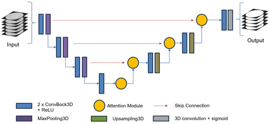In this work, a proposed network based on the 3D U-Net architecture [16] is proposed. An overview of the main architecture can be seen in Figure 3. This network has four levels of 3D downsampling and upsampling, with the number of filters increasing progressively at each level: 16, 32, 64, and 128. As the downsampling levels progress, the dimensions of the feature maps are halved. This constraint explains why the number eight was chosen in the preceding section: the number of slices in a group must be a power of two. The ReLU activation function [27] was used in these processes. The attention module is used before each upsampling layer and receives as input two sets of feature maps: those coming from the output of the previous layer and the skip connection. This approach was inspired by the works of Oktay et al. [28] and Li et al. [29].
