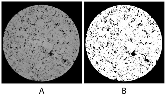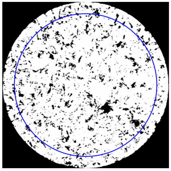 Before these calculations are performed, a circular sub-area with a radius of 100 pixels is delimited from the center of the sample (Figure 4). Thus, possible damage to the sample edges caused by the capture process is disregarded. According to Dantas et al. [12], the porosity (P) of a volume can be measured according to Equations (6) and (7):